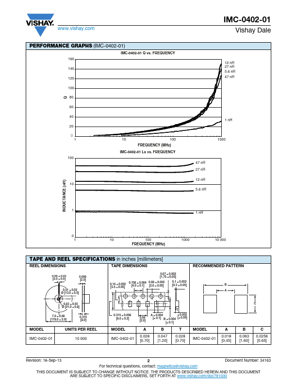 IMC-0402-01 10 nH MODEL INDUCTANCE VALUE ±5% INDUCTANCE TOLERANCE ER PACKAGE CODE e4 JEDEC LEAD (Pb)-FREE STANDARD GLOBAL PART NUMBER I M C 0 4 0 2 E R 1 0 N J 0 1 PRODUCT FAMILY SIZE PACKAGE CODE INDUCTANCE VALUE TOL.SERIES Revision: 18-Sep-13 1 Document Number: 34163 For technical questions, contact: magnetics@vishay.com THIS DOCUMENT IS SUBJECT TO CHANGE WITHOUT NOTICE.THE PRODUCTS DESCRIBED HEREIN AND THIS DOCUMENT ARE SUBJECT TO SPECIFIC DISCLAIMERS, SET
