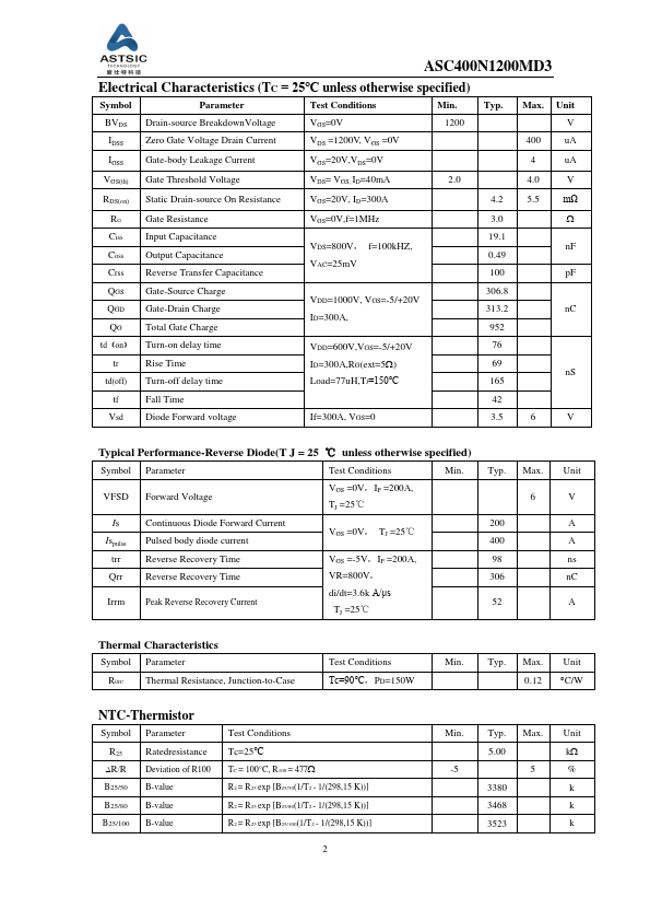 The ASC400N1200MD3 by ASTSIC is a 1200V SiC MOSFET Module. Below is the official datasheet preview.