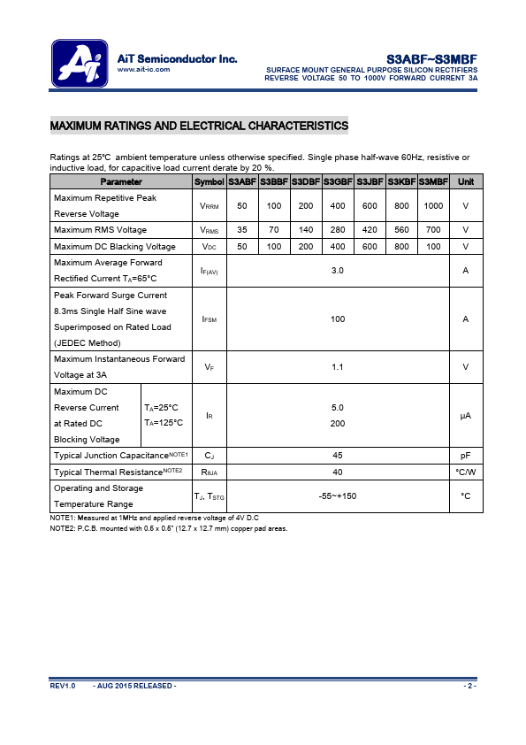 AiT Semiconductor Inc.www.ait-ic.com S3ABF~S3MBF SURFACE MOUNT GENERAL PURPOSE SILICON RECTIFIERS REVERSE VOLTAGE 50 TO 1000V FORWARD CURRENT 3A DE.Features