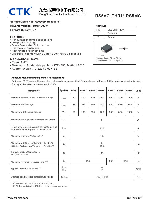 DongGuan Tongke Electronic Co.,LTD Surface Mount Fast Recovery Rectifiers Reverse Voltage - 50 to 1000 V Forward Current - 5 A .