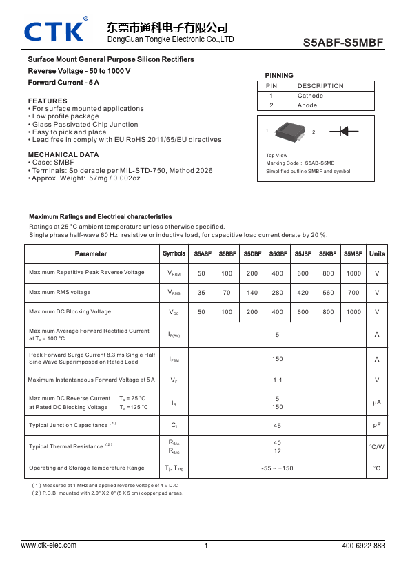 DongGuan Tongke Electronic Co.,LTD Surface Mount General Purpose Silicon Rectifiers Reverse Voltage - 50 to 1000 V Forward Current - 5 A .Applications