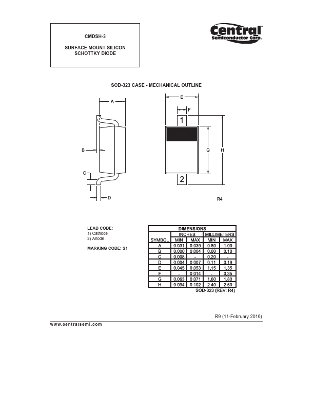 The CENTRAL SEMICONDUCTOR CMDSH-3 is a silicon Schottky diode, manufactured in an SOD-323 surface mount package, designed for fast switching applications requiring a low forward voltage drop.