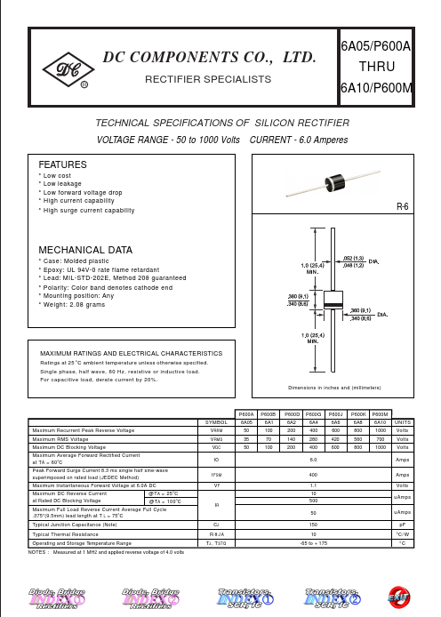 DC COMPONENTS CO., LTD.R RECTIFIER SPECIALISTS 6A05/P600A THRU 6A10/P600M TECHNICAL SPECIFICATIONS OF SILICON RECTIFIER VOLTAGE RANGE - 50 to 100.Features