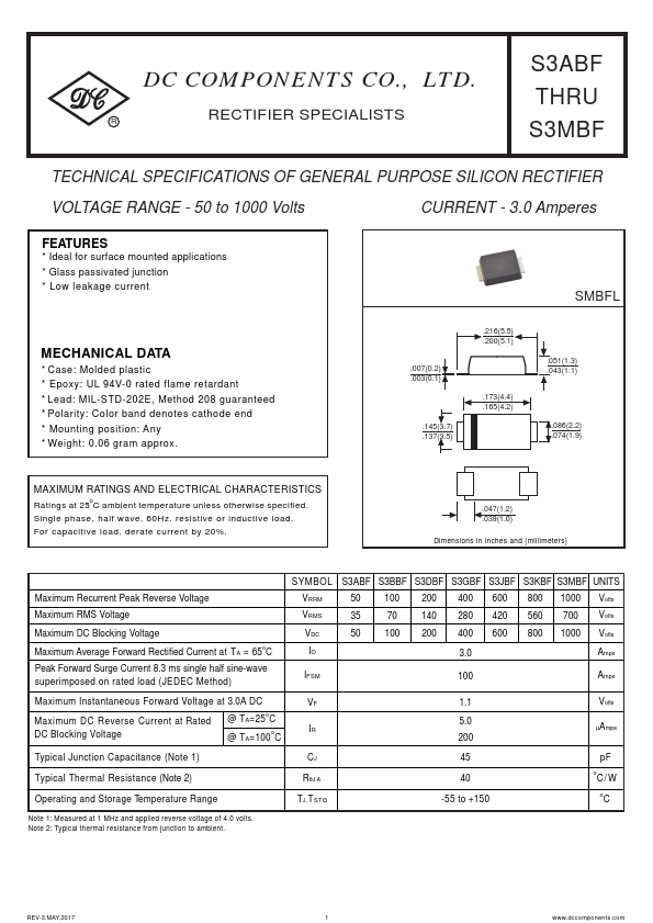 DC COMPONENTS CO., LTD.R RECTIFIER SPECIALISTS S3ABF THRU S3MBF TECHNICAL SPECIFICATIONS OF GENERAL PURPOSE SILICON RECTIFIER VOLTAGE RANGE - 50.Applications