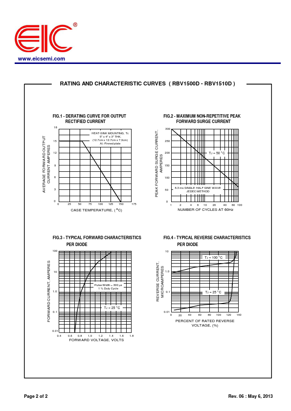 www.eicsemi.com RBV1500D - RBV1510D SILICON BRIDGE RECTIFIERS PRV : 50 - 1000 Volts Io : 15 Amperes .RBV1500D Features