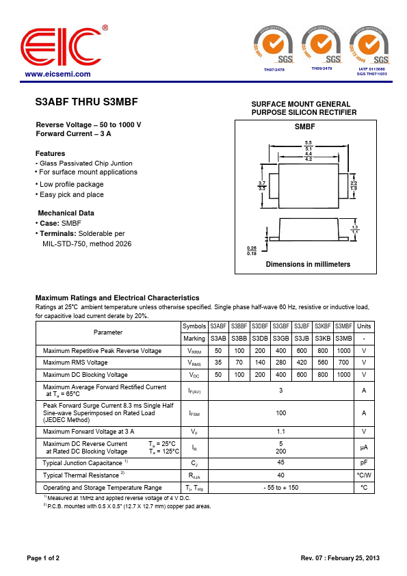 www.eicsemi.com S3ABF THRU S3MBF Reverse Voltage * 50 to 1000 V Forward Current * 3 A .Features