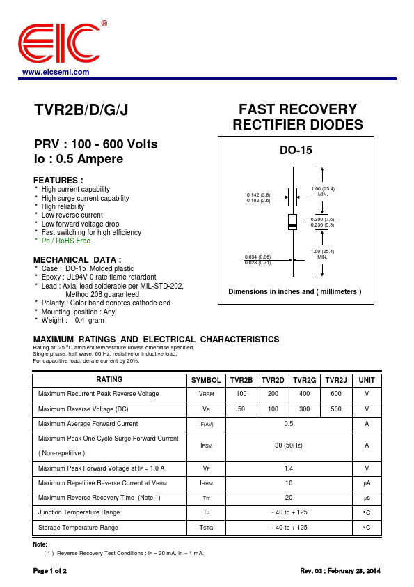 www.eicsemi.com TVR2B/D/G/J PRV : 100 - 600 Volts Io : 0.5 Ampere FAST RECOVERY RECTIFIER DIODES DO-15 .Features