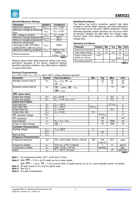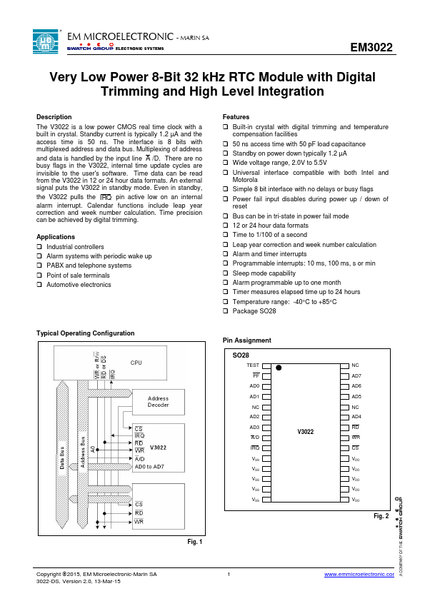 * Built-in crystal with digital trimming and temperature compensation facilities 50 ns access time with 50 pF load capacitance Standby on power down typically 1.2 µA Wide voltage range, 2.0V to 5.5V Universal interface compatible with both Intel and Motorola Simple 8 bit interface with noEM3022 Distributors