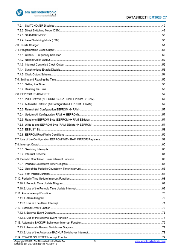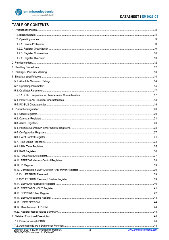 DATASHEET Ɩ EM3028-C7 EXTREME LOW POWER RTC MODULE WITH I2C, 32-bit UNIX time counter, 43 bytes EEPROM, Battery Switchover and Trickle Charger GENER.Features