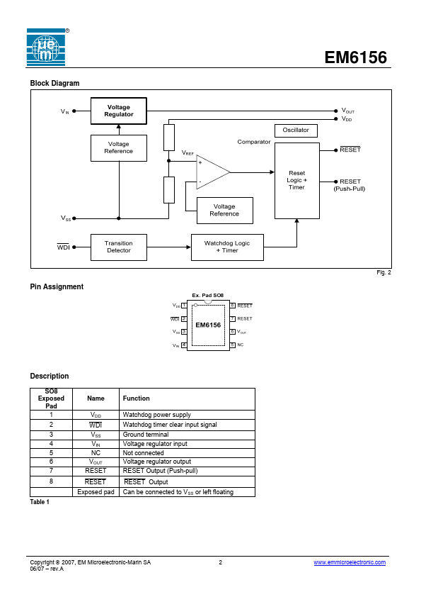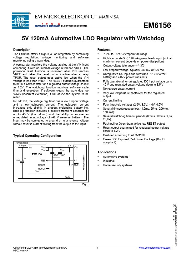 R EM MICROELECTRONIC - MARIN SA EM6156 5V 120mA Automotive LDO Regulator with Watchdog .Features