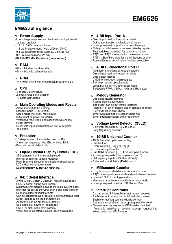 R EM MICROELECTRONIC - MARIN SA EM6626 Ultra Low Power Microcontroller with 4x32 LCD Driver .EM6626 Features