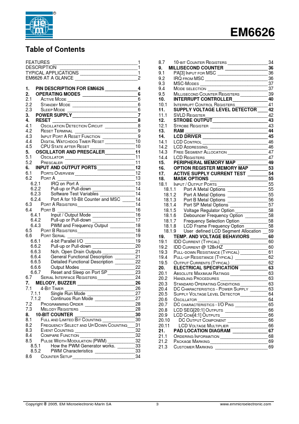 * True Low Power 1.8 µA active mode, LCD On 0.4 µA standby mode, LCD Off 0.2 µA sleep mode @ 3 V, 32 KHz, 25 ºC Low Supply Voltage 1.2 V to 3.6 V Melody, 7 tones + silence inclusive 4-bit timer Universal 10-bit counter, PWM, event counter LCD 32 segments, 3 or 4 times multiplexed TemperatuEM6626 Applications