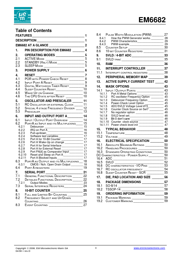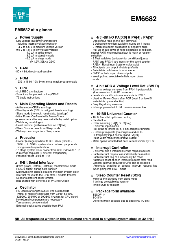 EM MICROELECTRONIC - MARIN SA EM6682 Ultra Low Power 8-pin Microcontroller .