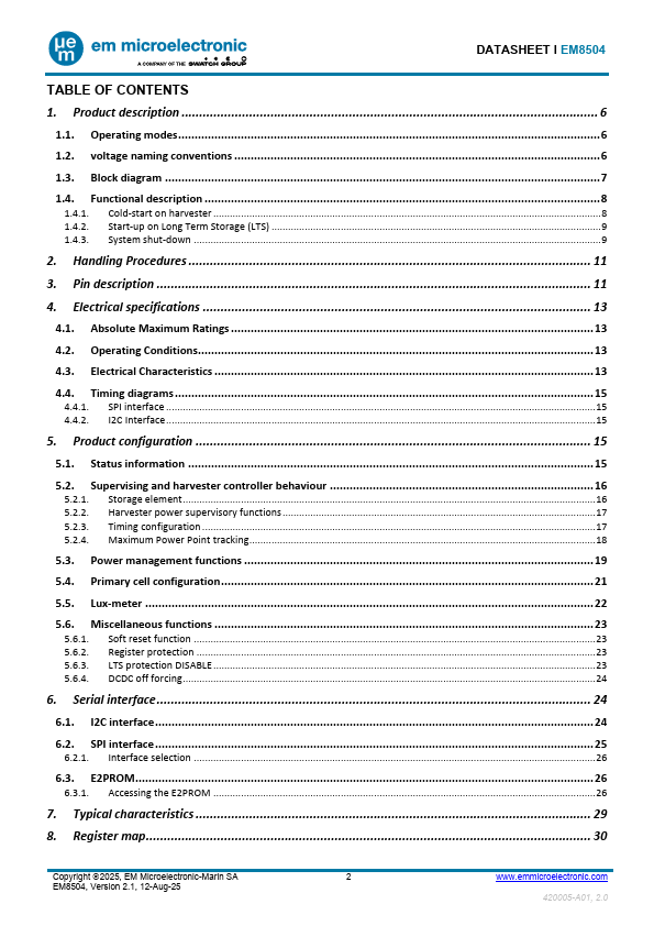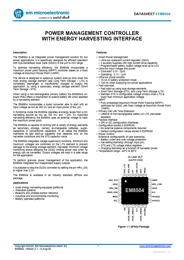 DATASHEET Ɩ EM8504 POWER MANAGEMENT CONTROLLER WITH ENERGY HARVESTING INTERFACE .Features