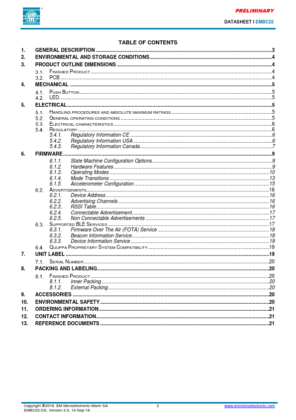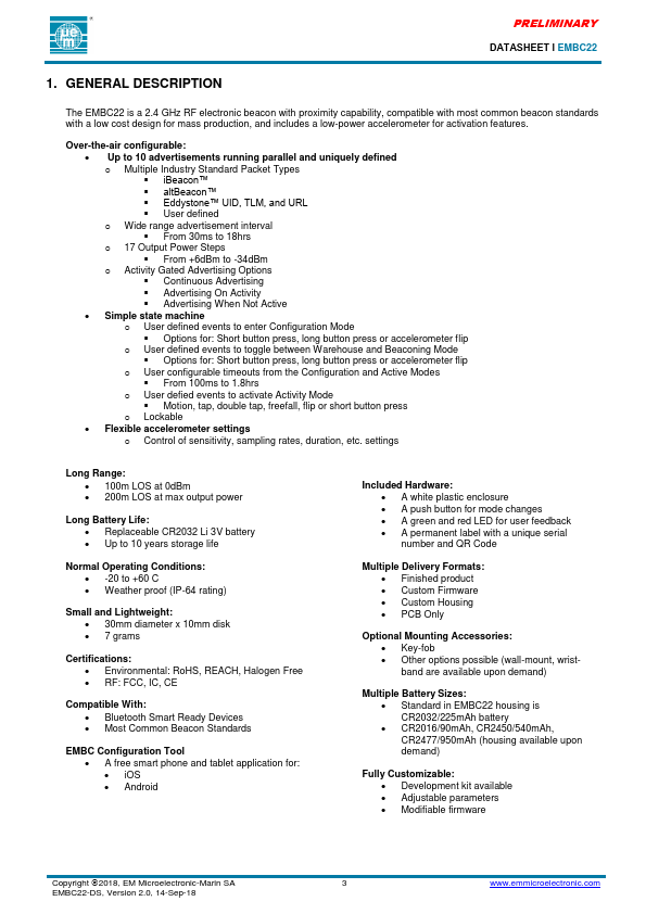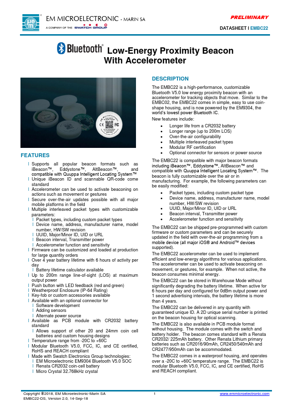 EM MICROELECTRONIC - MARIN SA PRELIMINARY DATASHEET Ɩ EMBC22 Low-Energy Proximity Beacon With Accelerometer .Features