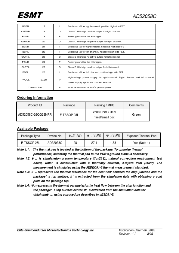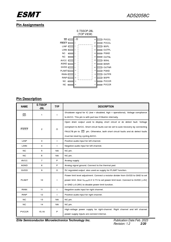 ESMT AD52058C 2x15WStereo Class-D Audio Amplifier with Power Limit .