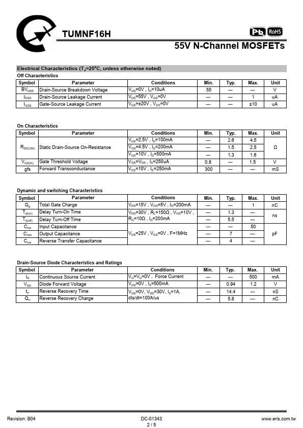 Datasheet Details Part number TUMNF16H Manufacturer Eris File Size 271.21 KB Datasheet TUMNF16H-Eris.pdf Description 55V N-Channel MOSFET