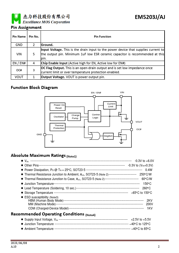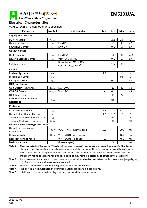 - include soft start, current limit protection, Power-On-Reset function, and over temperature protection. The EM5203J/AJ is available in SOT23-5L package.