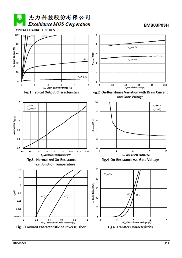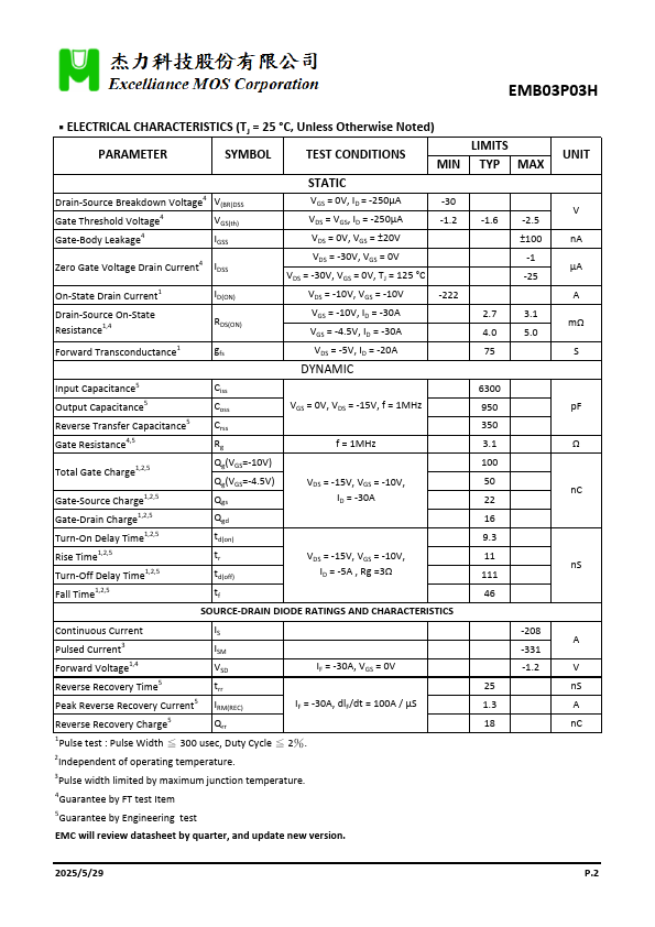 P-CH BVDSS -30V RDSON (MAX.)@VGS=-10V RDSON (MAX.)@VGS=-4.5V ID @TC=25℃ 3.1mΩ 5.0mΩ -222A Single P Channel MOSFET UIS, Rg 100% Tested RoHS & Halogen Free & TSCA Compliant ABSOLUTE MAXIMUM RATINGS (TC = 25 °C Unless Otherwise Noted) PARAMETERS/TEST CONDITIONS SYMBOL LIMITS Gate-Source Voltage Continuous Drain Current1 Pulsed Drain Current1 Avalanche Current1,4 Avalanche Energy1,4 Repetitive Avalanche Energy2,4 TC = 25 °C TC = 100 °C TA= 25 °C TA= 70 °C L = 0.1mH L = 0.05mH Powe