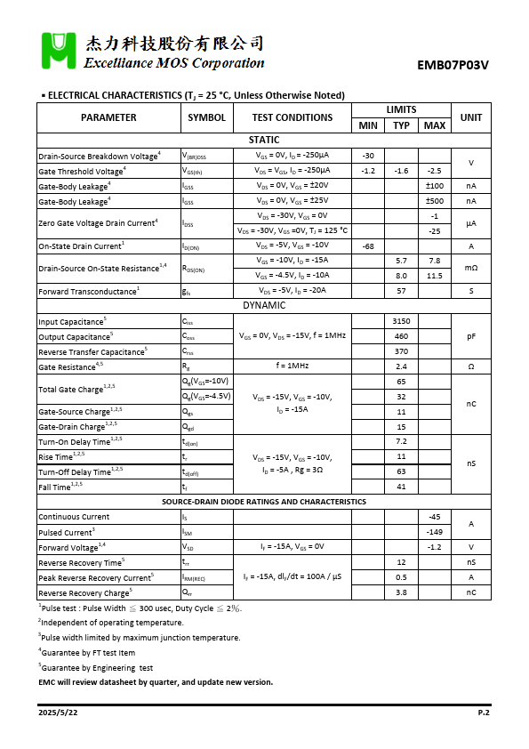 P-CH BVDSS RDSON (MAX.)@VGS=-10V RDSON (MAX.)@VGS=-4.5V ID @TC=25℃ -30 V 7.8 mΩ 11.5 mΩ -68 A ID @TA=25℃ -13 A Single P Channel MOSFET UIS, Rg 100% Tested RoHS & Halogen Free & TSCA Compliant ABSOLUTE MAXIMUM RATINGS (TC = 25 °C Unless Otherwise Noted) PARAMETERS/TEST CONDITIONS SYMBOL LIMITS Gate-Source Voltage VGS ±25 Continuous Drain Current1 TC = 25 °C TC = 100 °C ID -68 -43 Continuous Drain Current1 TA = 25 °C TA = 70 °C ID -13 -11 Pulsed Drain Current1 IDM -149
