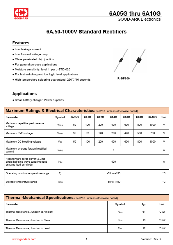 6A05G thru 6A10G GOOD-ARK Electronics 6A,50-1000V Standard Rectifiers .Features