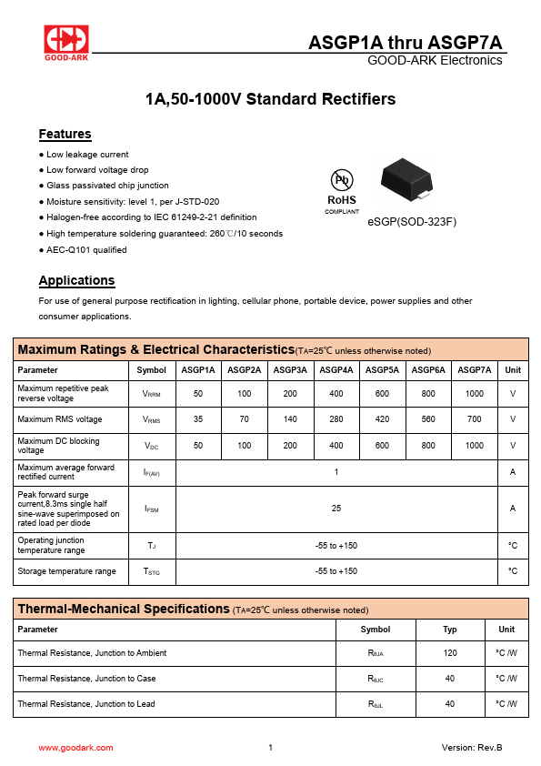 * For use of general purpose rectification in lighting, cellular phone, portable device, power supplies and other consumer applications. Maximum Ratings & Electrical Characteristics(TA=25℃ unless otherwise noted)