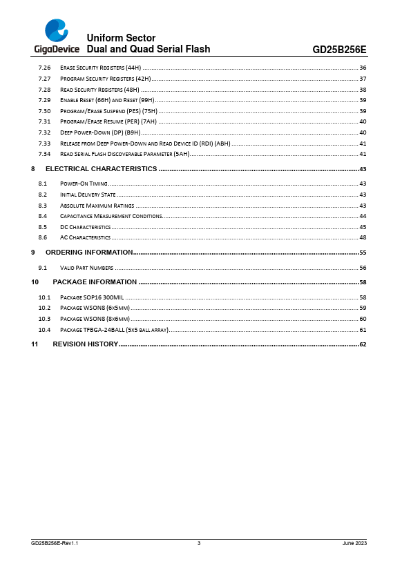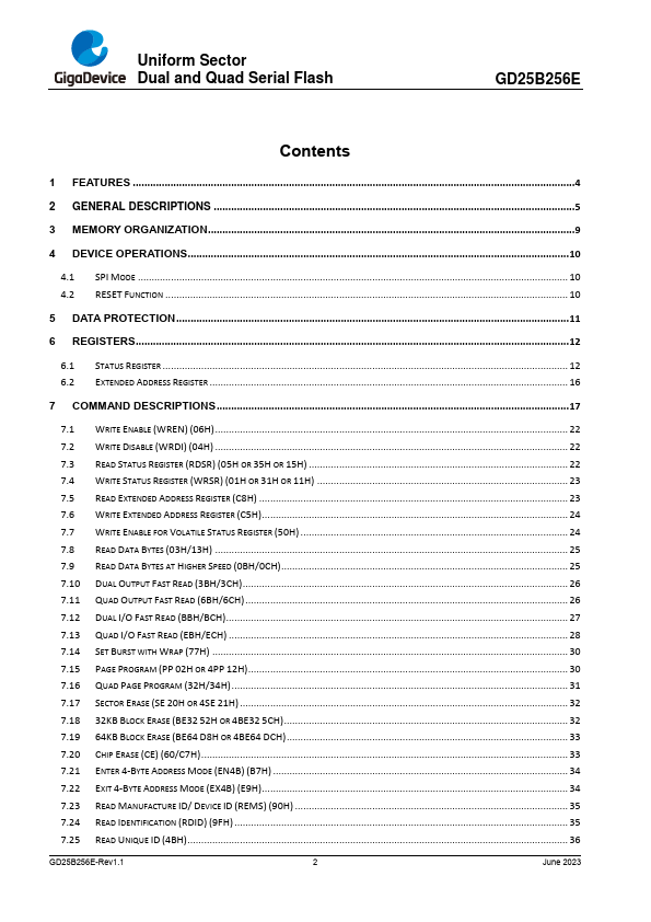 5 3 MEMORY ORGANIZATION9 4 DEVICE OPERATIONS10 4.1 SPI MODE 10 4.2 RESET FUNCTION 10 5 DATA PROTECTION11 6 REGISTERS12 6.1 STATUS REGISTER 12 6.2 EXTENDED ADDRESS REGISTER 16 7 COMMAND DESCRIPTIONS17 7.1 WRITE ENABLE (WREN) (06H) 22 7.2 WRITE DISABLE (WRDI) (04H) 22 7.3 READ STATUS REGISTER (RDSR) (05H OR 35H OR 15H) 22 7.4 WRITE STATUS REGISTER (WRSR) (01H OR 31H OR 11H) 23 7.5 READ EXTENDED ADDRESS REGISTER (C8H) 23 7.6 WRITE EXTENDED ADDRESS REGISTER (C5H) 24 7.7 WRITE ENABLE