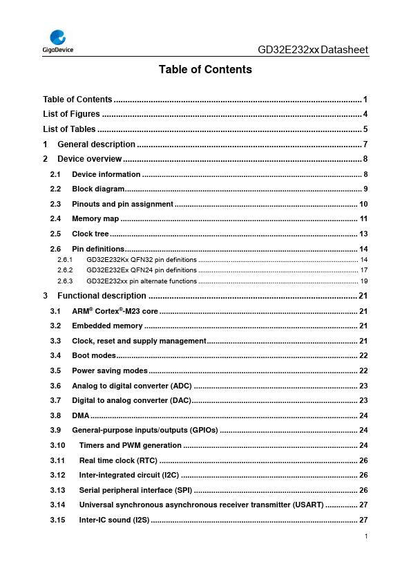 This datasheet PDF includes multiple part numbers: GD32E232K4Q7, GD32E232E4U7. Please refer to the document for exact specifications by model. |