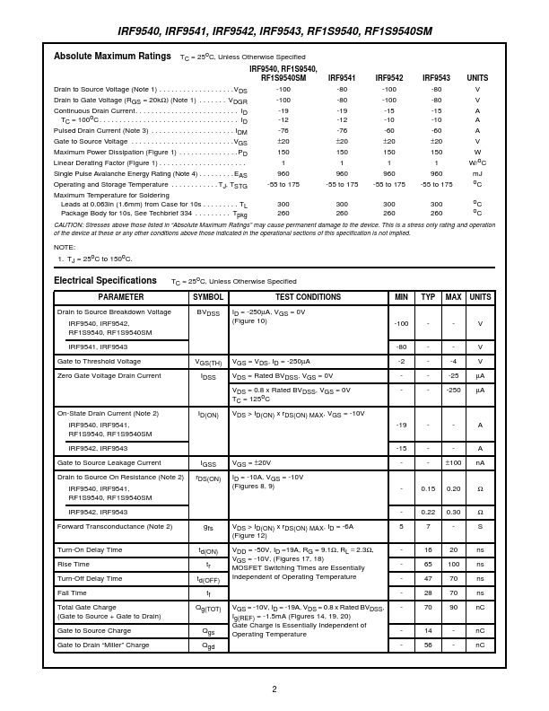 -15A and -19A, -80V and -100V rDS(ON) = 0.20Ω and 0.30Ω Single Pulse Avalanche Energy Rated SOA is Power Dissipation Limited Nanosecond Switching Speeds Linear Transfer Characteristics High Input Impedance Related Literature - TB334 “Guidelines for Soldering Surface Mount Components to PC Boards” Ordering Information PART NUMBER PACKAGE BRAND These are P-Channel enhancement mode silicon gate power field effect t