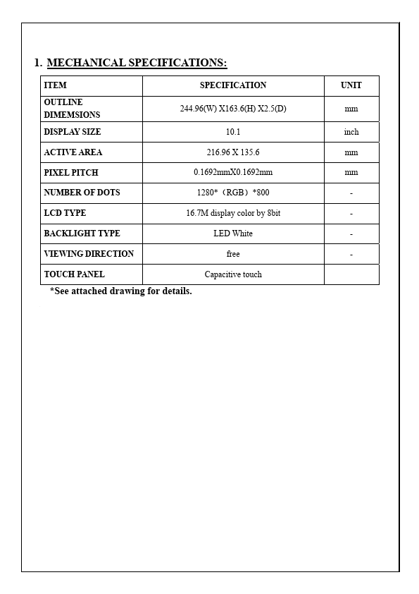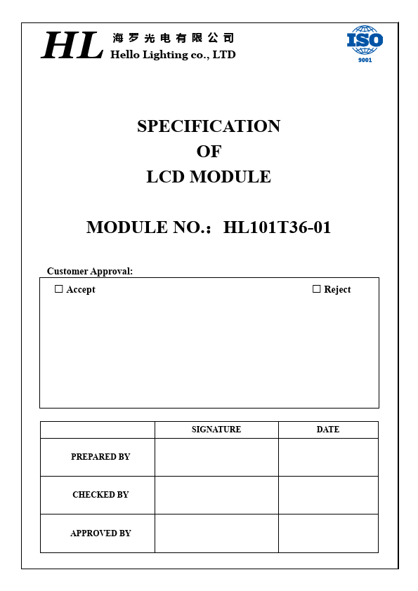 HL Hello Lighting co., LTD SPECIFICATION OF LCD MODULE MODULE NO.:HL101T36-01 Customer Approval: * Accept * Reject PREPAR.HL101T36-01 Distributors