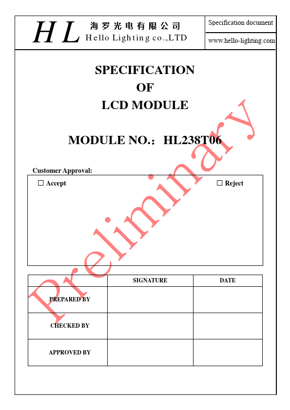 HL Hello Lighting co.,LTD Specification document www.hello-lighting.com SPECIFICATION OF LCD MODULE MODULE NO.:HL238T06 Customer Approval:.HL238T06 Distributors