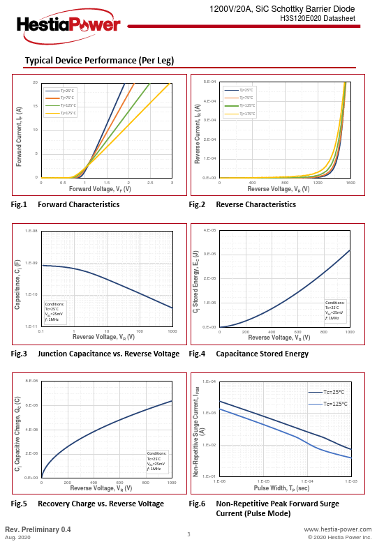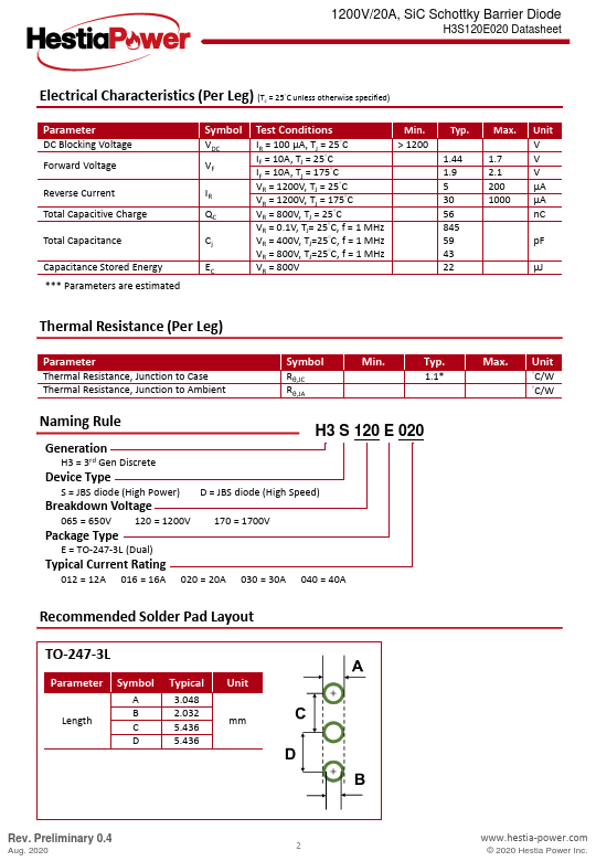 The H3S120E020 by Hestia Power is a 1200V/20A SiC Schottky Barrier Diode. Below is the official datasheet preview.