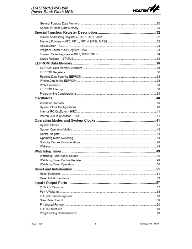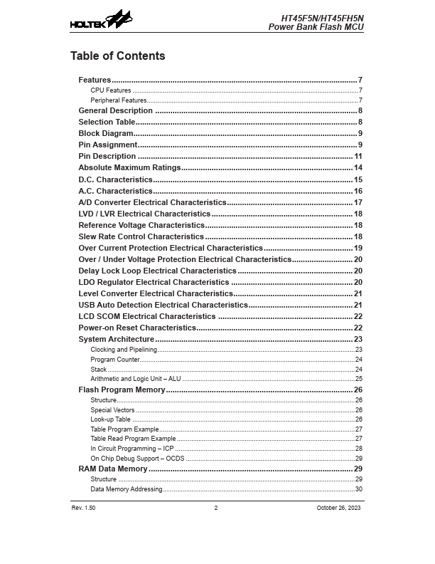 Power Bank Flash MCU HT45F5N/HT45FH5N Revision: V1.50 Date: October 26, 2023 HT45F5N/HT45FH5N Power Bank Flash MCU Table of Contents .