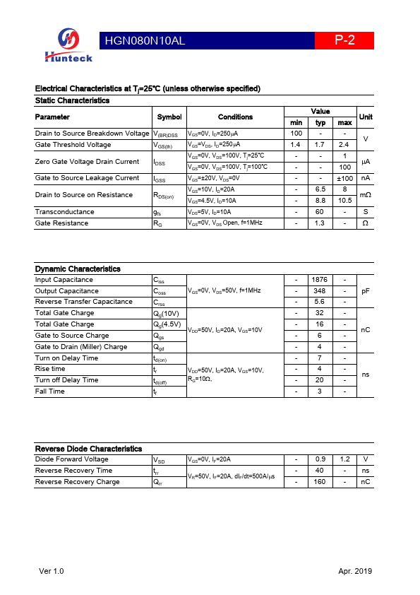 The HGN080N10AL by Hunteck is a 100V N-Ch Power MOSFET. Below is the official datasheet preview.