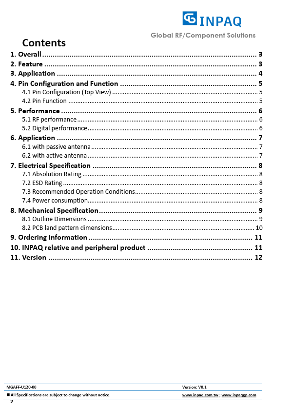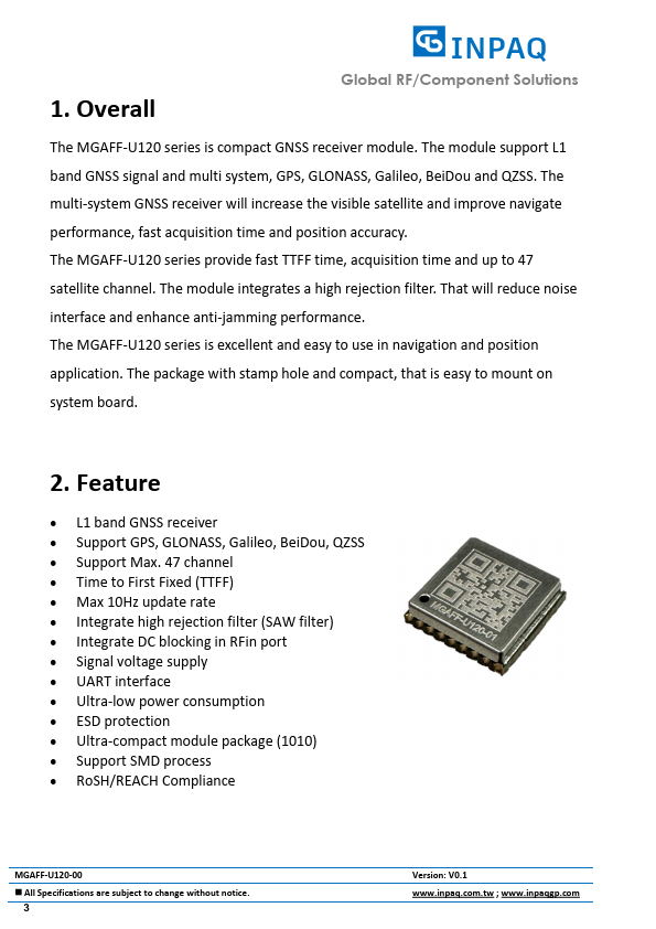 2 UART_TX O UART transmit, 1.8V level 3 UART_RX I UART receive, 1.8V level 3 PPS O 1PPS signal, 1.8V level 6 V_BACKUP P Backup Voltage supply 8 VCC P Voltage supply 11 RFIN I RF input, internal DC block 14 VCC_ANT P Voltage Supply for exte