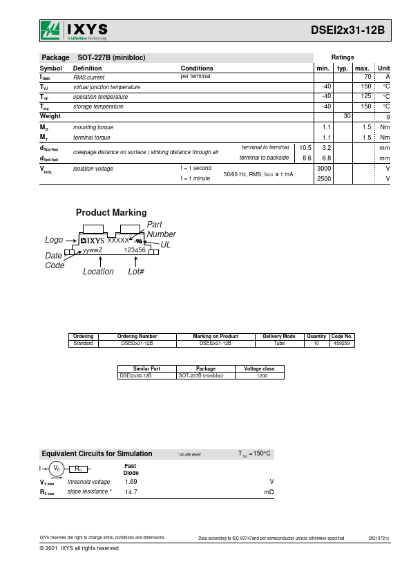 FRED Fast Recovery Epitaxial Diode Low Loss and Soft Recovery Parallel legs Part number DSEI2x31-12B 2 1 3 4 DSEI2x31-12B VRRM I FAV t rr = 120.DSEI2x31-12B Features