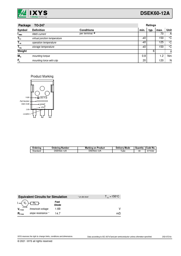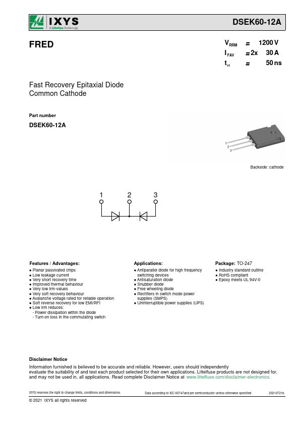 FRED Fast Recovery Epitaxial Diode Common Cathode Part number DSEK60-12A 1 2 3 DSEK60-12A VRRM I FAV t rr = 1200 V = 2x 30 A = 50 ns Backside: .Features