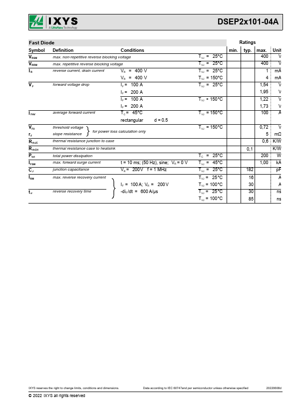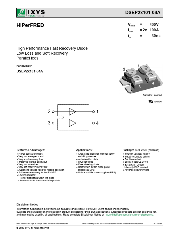 HiPerFRED High Performance Fast Recovery Diode Low Loss and Soft Recovery Parallel legs Part number DSEP2x101-04A 2 1 3 4 DSEP2x101-04A VRRM I F.Features