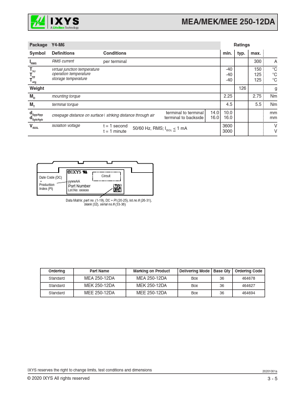 FRED Module Fast Recovery Epitaxial Diode MEA/MEK/MEE 250-12DA VRRM = 1200 V IFAVM = 260 A trr = 400 ns Part number MEA 250-12DA MEK 250-12DA MEE 25.Features