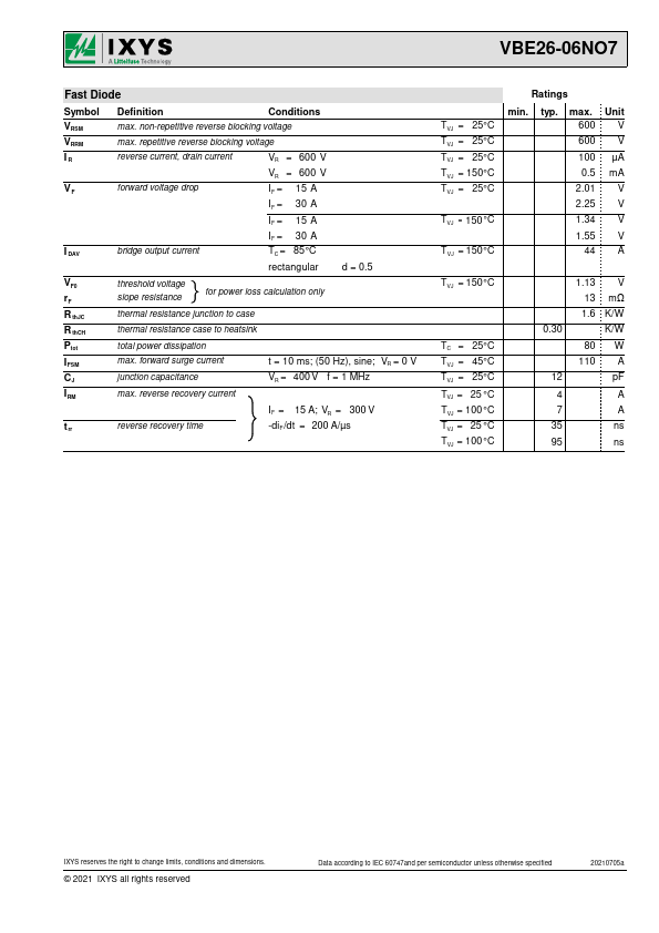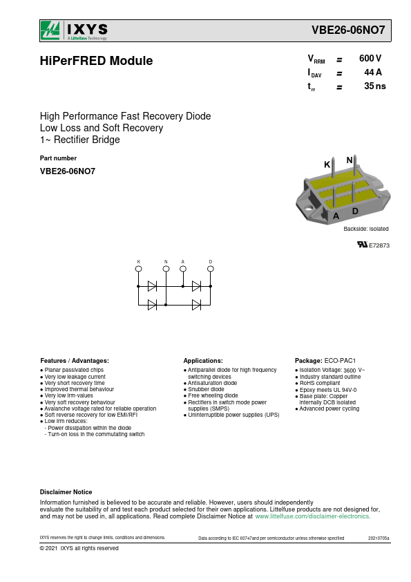 HiPerFRED Module High Performance Fast Recovery Diode Low Loss and Soft Recovery 1~ Rectifier Bridge Part number VBE26-06NO7 K N A D VBE26-06NO7 .Features