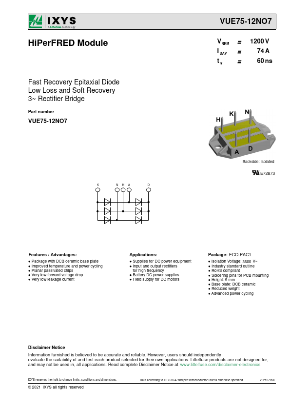 HiPerFRED Module Fast Recovery Epitaxial Diode Low Loss and Soft Recovery 3~ Rectifier Bridge Part number VUE75-12NO7 K NHA D VUE75-12NO7 VRRM = .Features