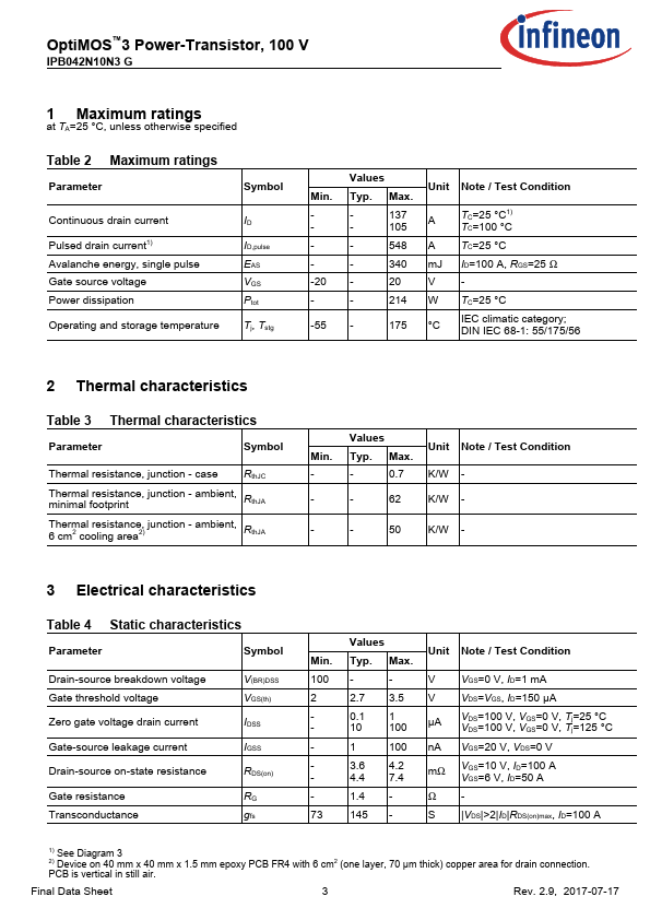 The 042N10N by Infineon is a 100V MOSFET. Below is the official datasheet preview.
