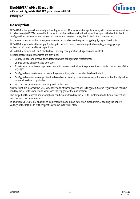 Description 2ED4820-EM is a gate driver designed for high current 48 V automotive applications, with powerful gate outputs to drive many MOSFETs in parallel in order to minimize the conduction losses.It supports the back-to-back configuration, both common source and common drain structures, thanks to its two gate outputs.In common source configuration, one gate output can be used to pre-charge highly capacitive loads.2ED4820-EM generates the supply for the gate outputs based on an integrated