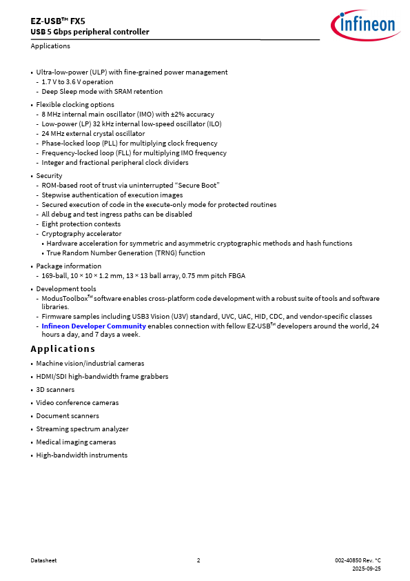 CYUSB308x EZ-USB™ FX5 USB 5 Gbps peripheral controller Overview EZ-USB™ FX5 is a family of USB 5 Gbps peripheral controllers targeting the next-genera.