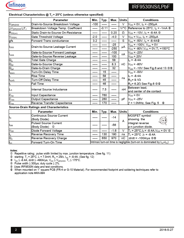 This datasheet PDF includes multiple part numbers: IRF9530NS, IRF9530NSPbF. Please refer to the document for exact specifications by model. |