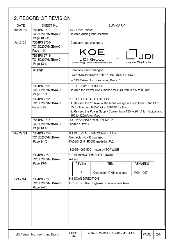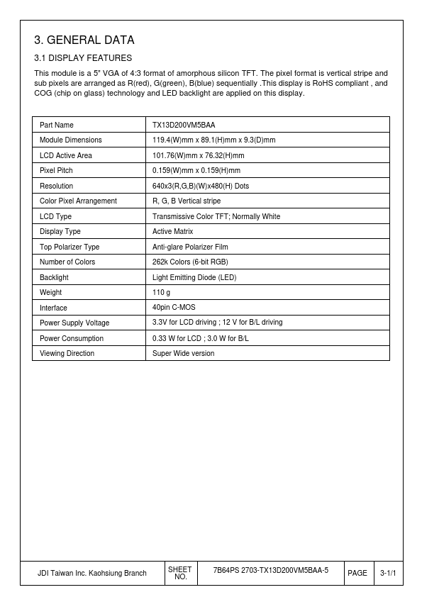 FOR MESSRS : DATE : Oct.7th,2024 CUSTOMER’S ACCEPTANCE SPECIFICATIONS TX13D200VM5BAA Contents No.ITEM 1 COVER 2 RECORD OF REVISION 3 GENERA.TX13D200VM5BAA Features