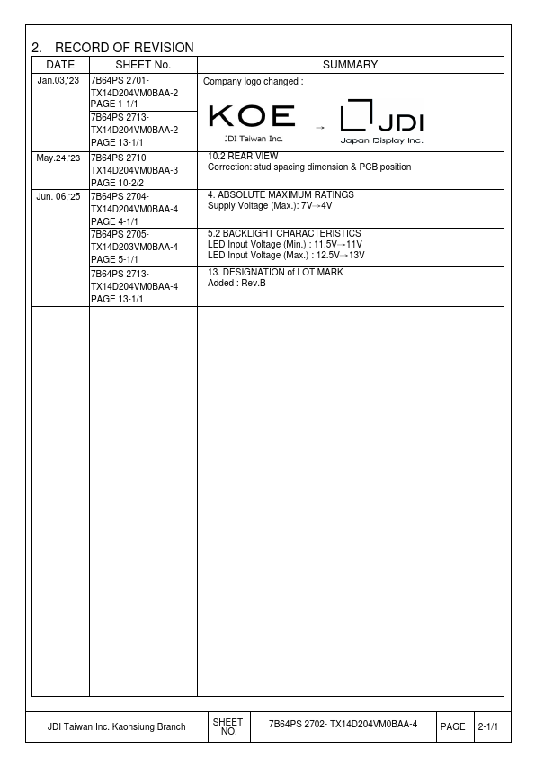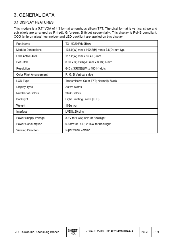 Datasheet Details Part number TX14D204VM0BAA Manufacturer JDI File Size 622.68 KB Datasheet TX14D204VM0BAA-JDI.pdf Description VGA of 4:3 format amorphous silicon TFT
