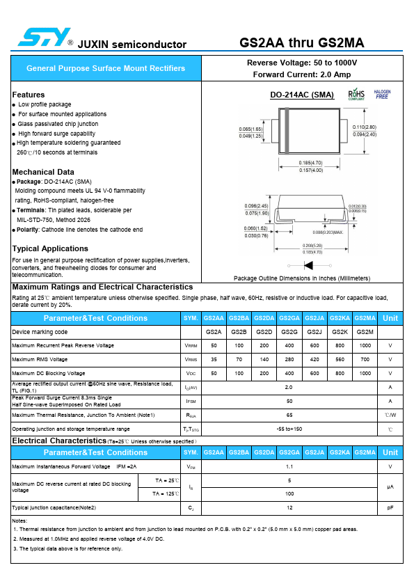 JUXIN semiconductor General Purpose Surface Mount Rectifiers GS2AA thru GS2MA Reverse Voltage: 50 to 1000V Forward Current: 2.0 Amp .Features