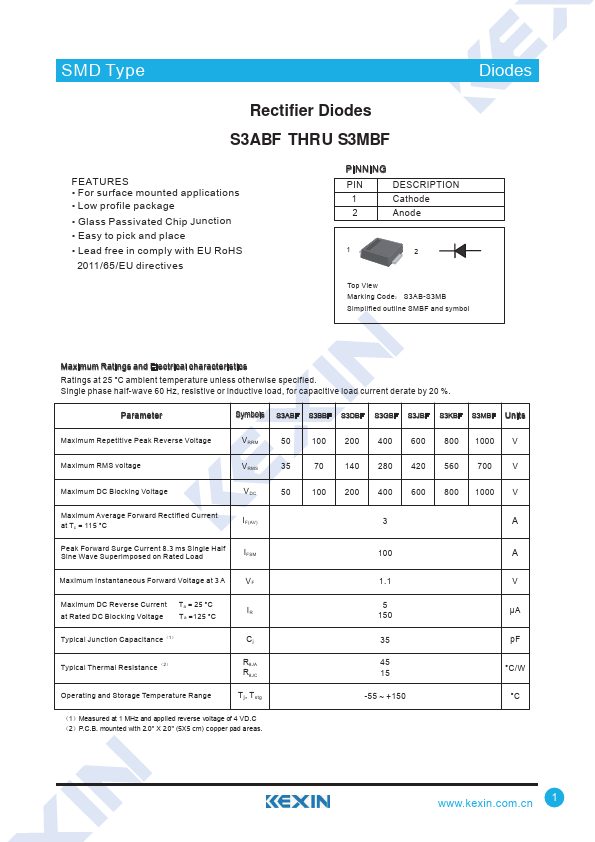 SMD Type Diodes Rectifier Diodes S3ABF THRU S3MBF .S3KBF Distributors