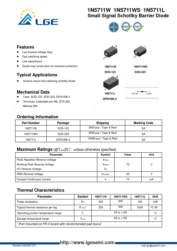 * Surface mount fast switching schottky diode 1N5711W SOD-123 1N5711WS SOD-323 Mechanical Data1N5711W Distributors